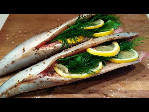- Рыбу натирают солью и смесью специй внутри и снаружи. Внутрь кладут свежий укроп и петрушку, а также дольки лимона.